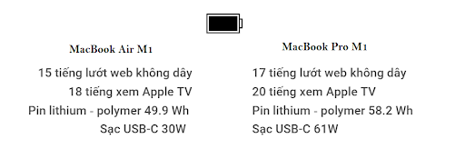 Nhờ vào con chip M1 mà MacBook M1 sở hữu khả năng tiết kiệm pin đáng kinh ngạc giúp cho tuổi thọ pin lâu hơn. Thời gian sử dụng trên MacBook Air M1 được Apple công bố lên đến 18 giờ liên tục, trong khi đó MacBook Pro M1 có thời gian onscreen nhỉnh hơn đôi chút với 20 giờ hoạt động liên tục. Thời gian sử dụng pin của MacBook Pro cao hơn nhờ nó được trang bị viên pin lớn hơn so với MacBook Air.