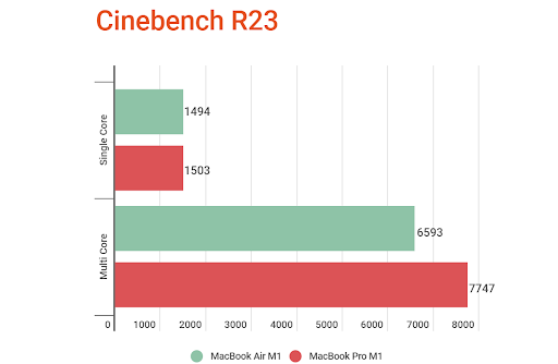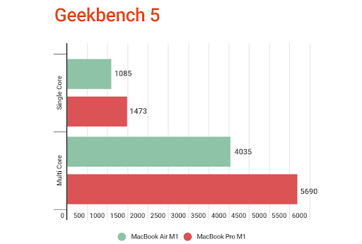 Ở bài test Geekbench 5, MacBook Air M1 có điểm đơn nhân là 1085 và MacBook Pro M1 là 1473. Điểm đa nhân lần lượt là 4035 và 5690. Kết quả cho thấy MacBook Air M1 và MacBook Pro M1 có điểm số đơn nhân và đa nhân khá cách biệt khi MacBook Pro M1 có điểm số hiệu năng cao hơn.