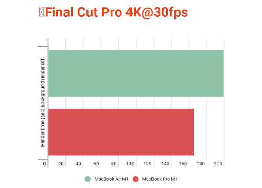 Với phần mềm dựng phim Final Cut Pro, cả hai chiếc máy đều cho một hiệu năng đồ họa ấn tượng khi edit video 4k rất mượt mà. Kết quả render định dạng 4K cho ra kết quả nhỉnh hơn với MacBook Pro M1. Điều này cho thấy dù cùng sử dụng 8 Core GPU nhưng MacBook Pro M1 vẫn có hiệu năng xử lý đồ họa mạnh mẽ hơn so với MacBook Air M1.