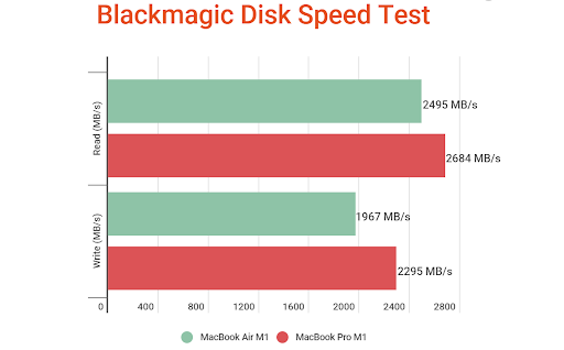 Ổ cứng SSD trên MacBook Pro M1 có tốc độ đọc vô cùng ấn tượng lên đến 2684 MB/s. Trong khi đó, MacBook Air cũng có tốc độ đọc dữ liệu siêu nhanh lên đến 2495 MB/s. Dù có sự chênh lệch nhẹ về tốc độ đọc ghi dữ liệu trên 2 chiếc MacBook này nhưng đây vẫn là một trong những chiếc máy có ổ cứng SSD nhanh nhất thế giới ở thời điểm hiện tại.